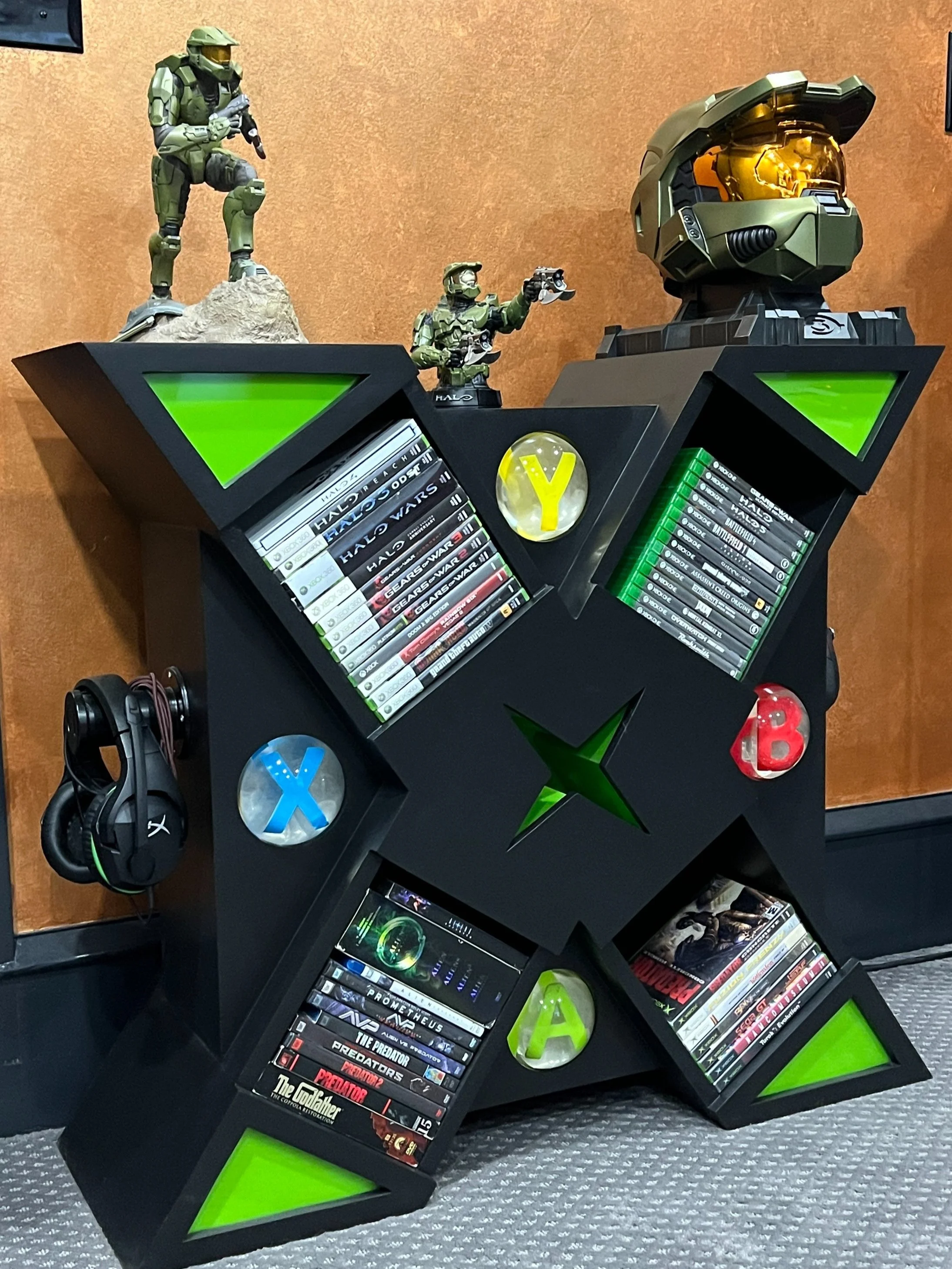This is an older project that I did before I even started Wired Workshop that I made to hold all of my old games and movies. I made this mostly out of MDF and acrylic but used plastic domes and epoxy for the big controller buttons, also all the buttons and green acrylic light up! I was trying to mimic the original Xbox theme with the open X in the middle and also added holders for a headset and controllers on the sides. In my old bedroom it was kind of tucked in a corner and couldn’t be seen to well, so I’m happy it finally gets a proper display in my office. If your really interested in this display or something similar let me know and I could make you one or even sell this one.